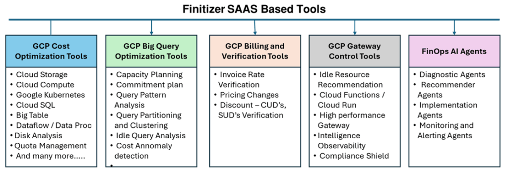Finitizer Cloud Workload Optimization solution  analyzes your entire Google Cloud infrastructure — compute, data, storage, networking, and serverless services to identify wasted spend. The solution surfaces cost reduction opportunities like right-sizing, idle resources, missed discounts and others. Our multi-tenant SaaS solution helps organizations reduce costs by 50%-60% through recommendations across 11 specialized modules.